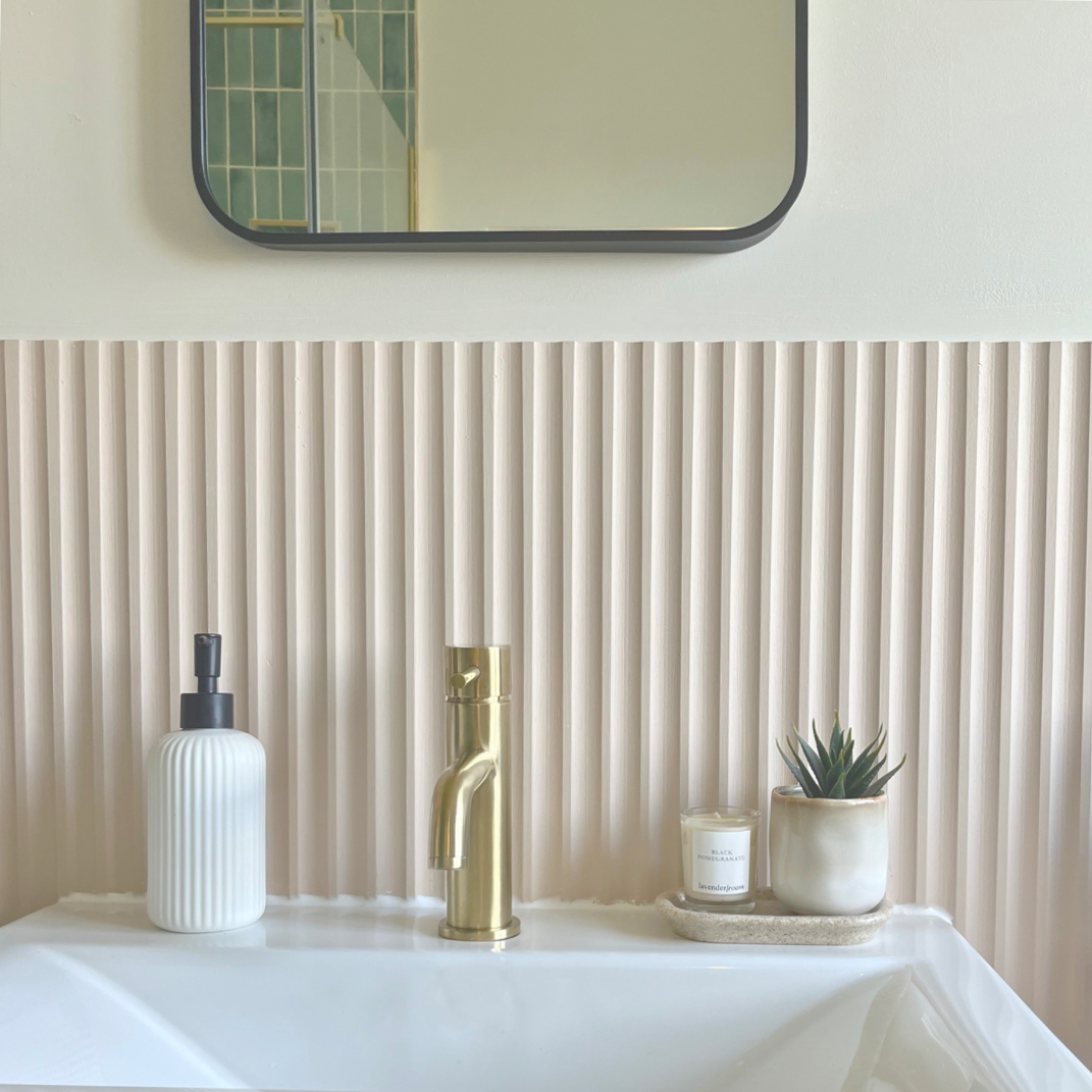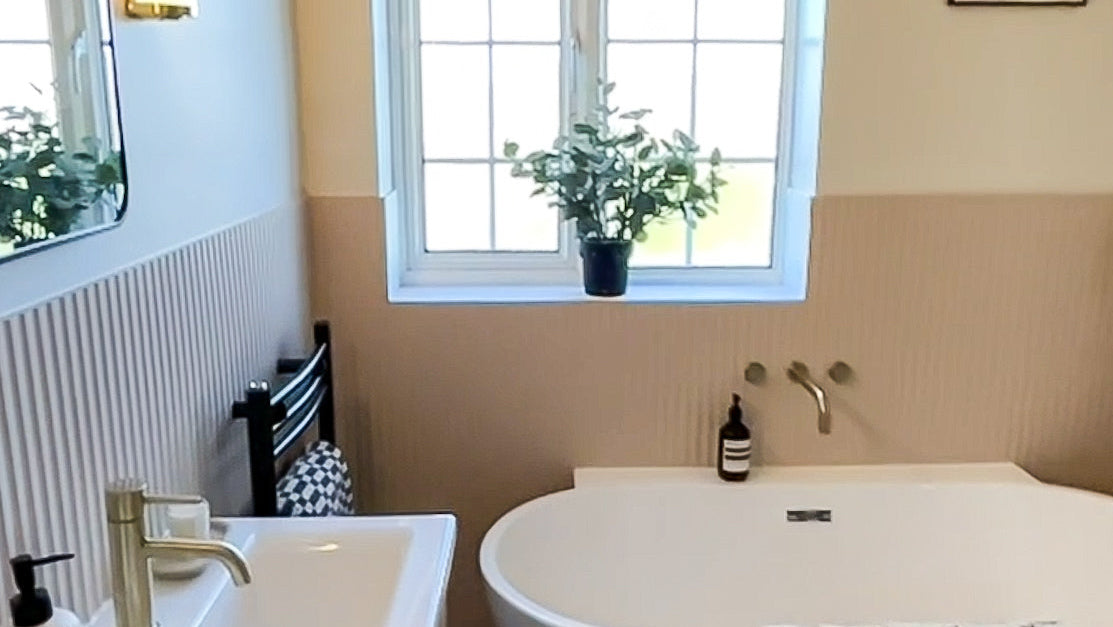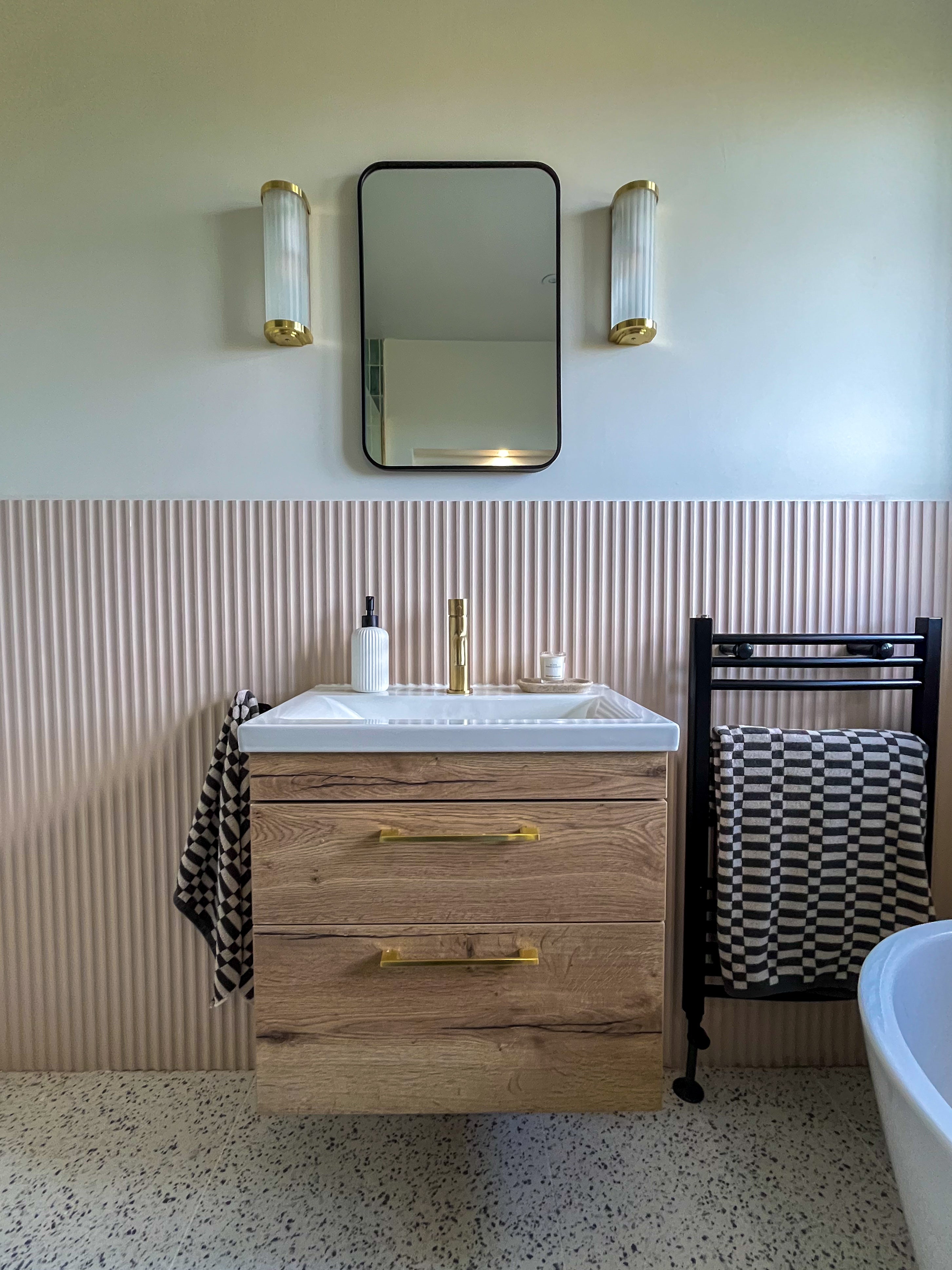 We transformed it into a light-filled, contemporary retreat with a soft, sophisticated palette. A fluted wall panelling detail in a warm blush tone adds subtle texture and character, while the deep green shower tiles bring a rich contrast and spa-like feel. The freestanding bath now takes pride of place beneath the window, creating a calm focal point perfect for long soaks.